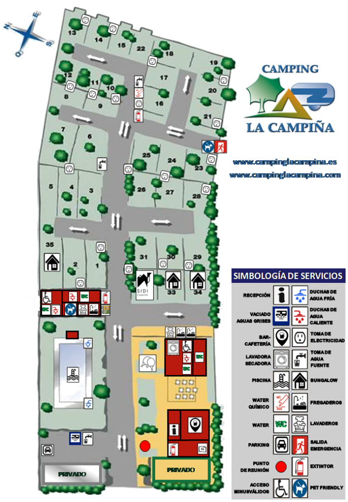 Hay una Estación de servicios para autocaravanas y Water Químico. Calles asfaltadas. Tienen unos 60-70 m2 y se encuentran ubicadas entre olivos y arboledas. Todas tienen toma de luz (10A) y agua. Conexión WIFI y sombra. Se admiten animales en las parcelas.